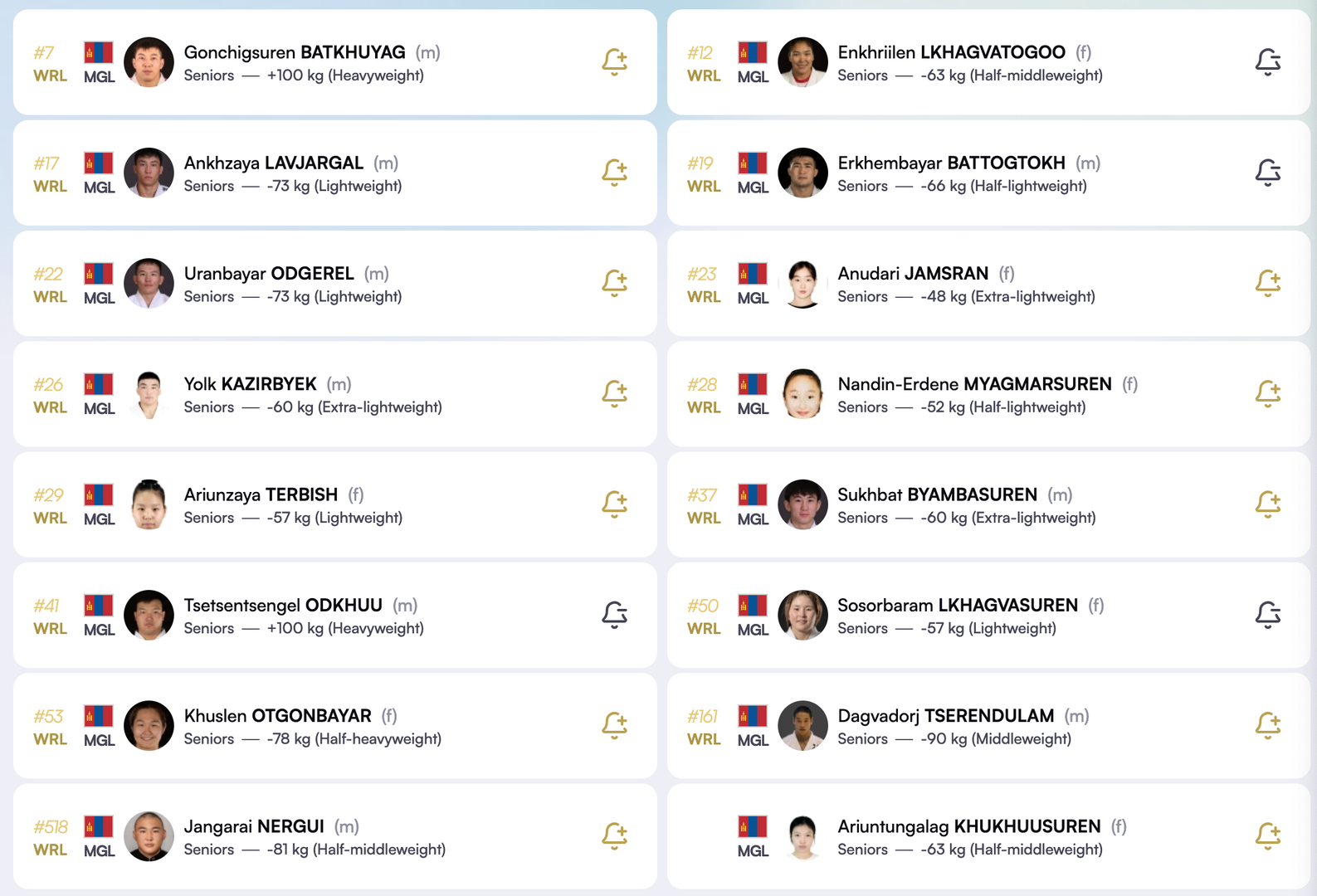 41 орны 306 шилдэг жүдоч оролцохоор мэдүүлгээ өгөөд байгаагийн дотор найман жингийн дэлхийн чансааг тэргүүлэгчид оролцохоор болоод байна.