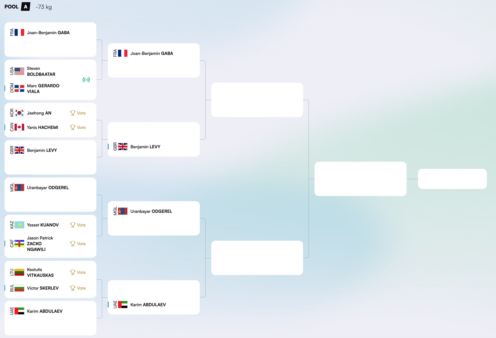 А хэсэгт 2025 оны Улаанбаатарын их дуулгын аварга О.Уранбаяр эхний тойрогт гоц мөргөсөн байгаа бол АНУ-ын нэр дээрээс барилдаж буй Болдбаатар Стивен эхний тойрогт Доминиканы бөхтэй учраа таарсан байна.